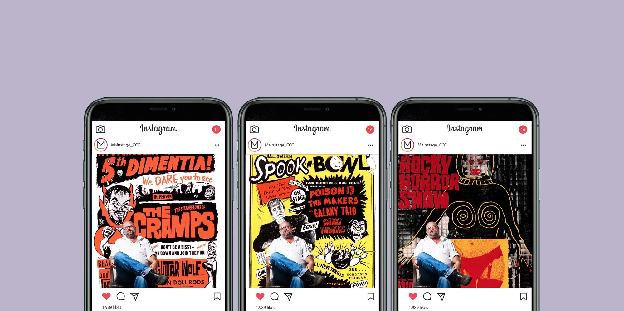 Instagram post layouts for the exhibition, which plays with the scale of his posters.