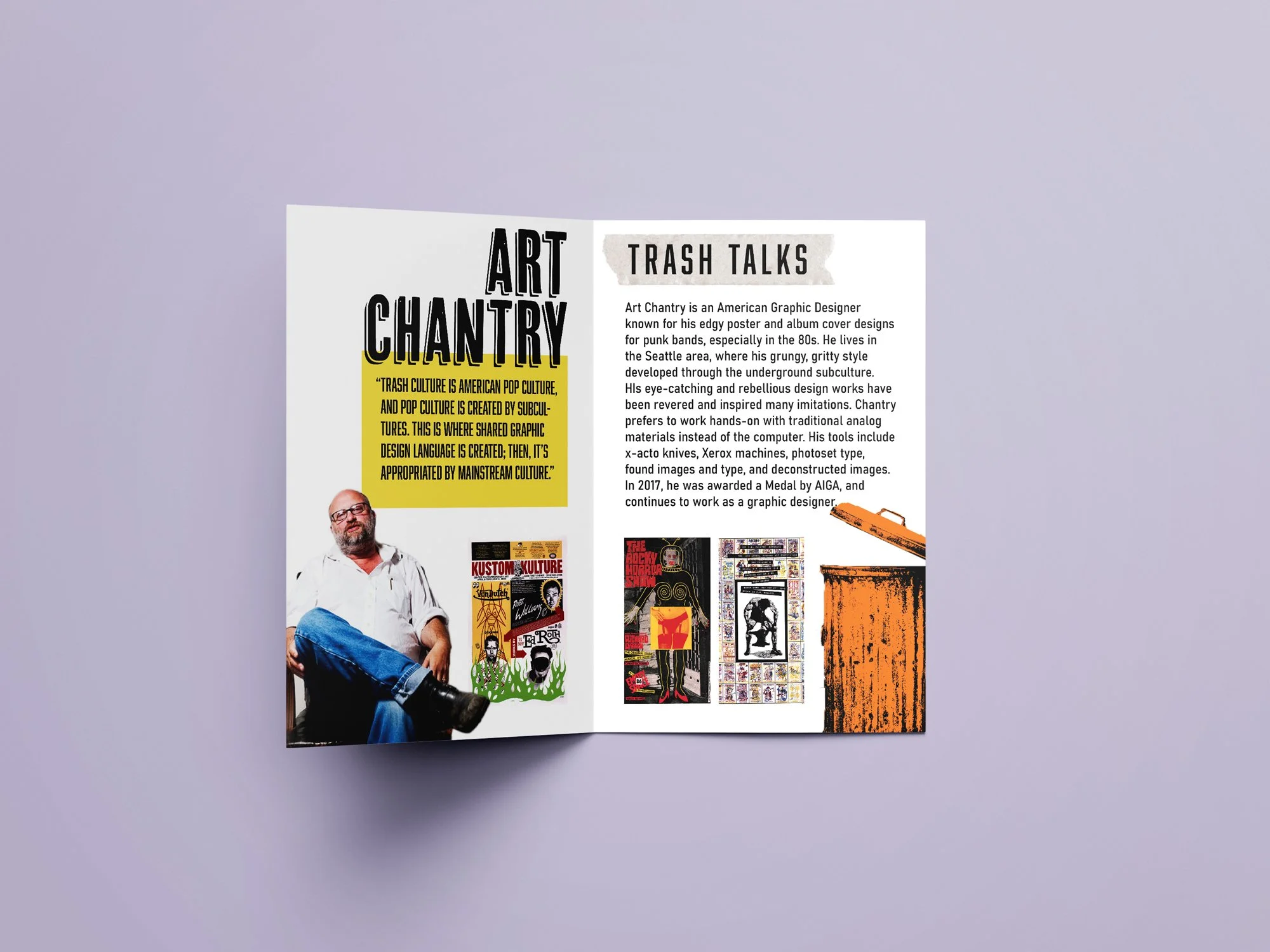 Brochure inside layout, with a quote from Art Chantry and a blurb about the designer.